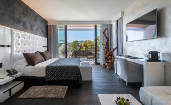 Lugar elegante en la cima de la colina, elegantes habitaciones de hotel. Construido y decorado con sabor. Terraza de restaurante con majestuosas vistas sobre colinas circundantes cubiertas de bosque mediterráneo, acantilados y rocas a distancia. Lugar correcto para desconectar y relajarse.