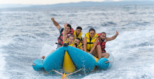 Aujourd'hui, nous avons fait l'activité de la banana, c'était très amusant, les garçons ont ri et ont crié de joie chaque fois qu'ils tombaient à l'eau. Le capitaine du bateau s'appelait Cristian, très sympathique.